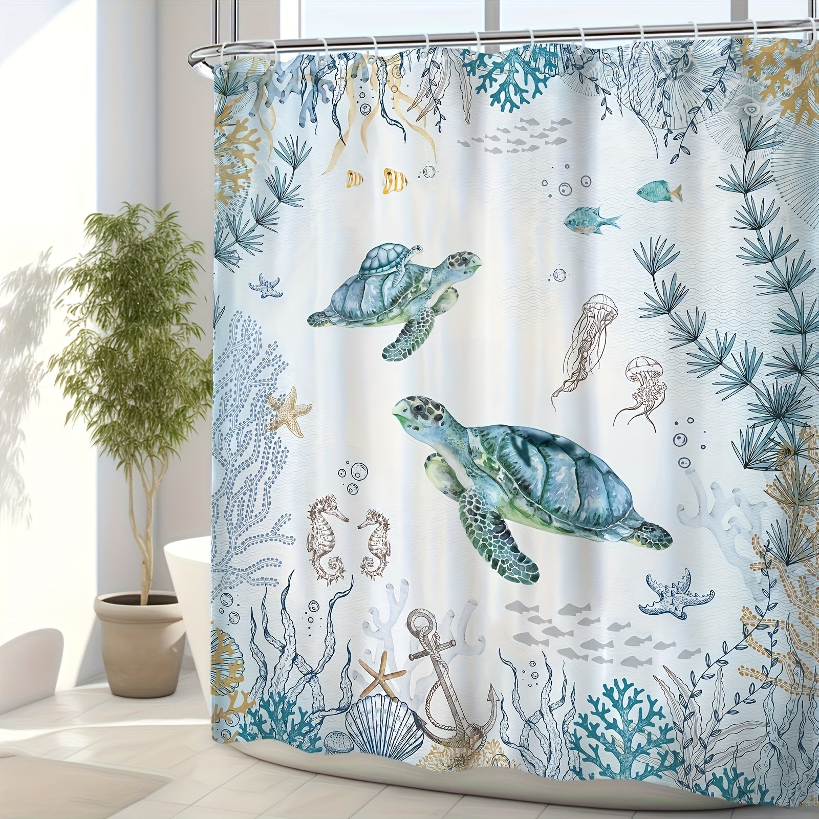 Transform your bathroom into a seaside retreat with this 4-piece Blue Coastal Nautical Bathroom Set. Featuring fish, coral, and sea turtle designs, the set includes a 2D flat shower curtain with 12 hooks, a non-slip bath floor mat, a U-shaped toilet mat, and a cover mat—everything you need to create a cohesive, stylish, and functional bathroom space.