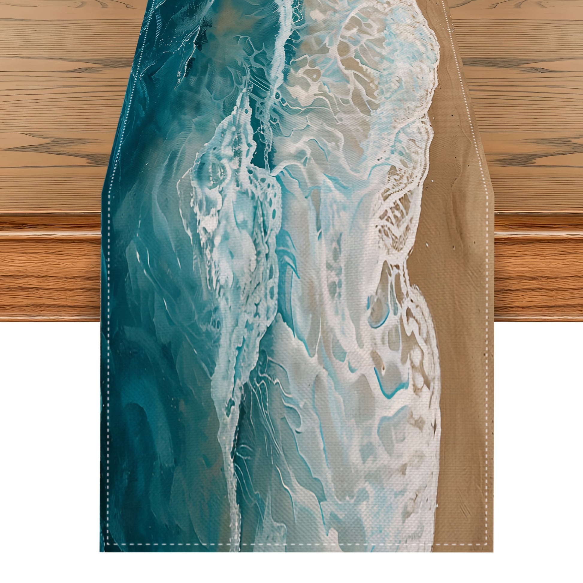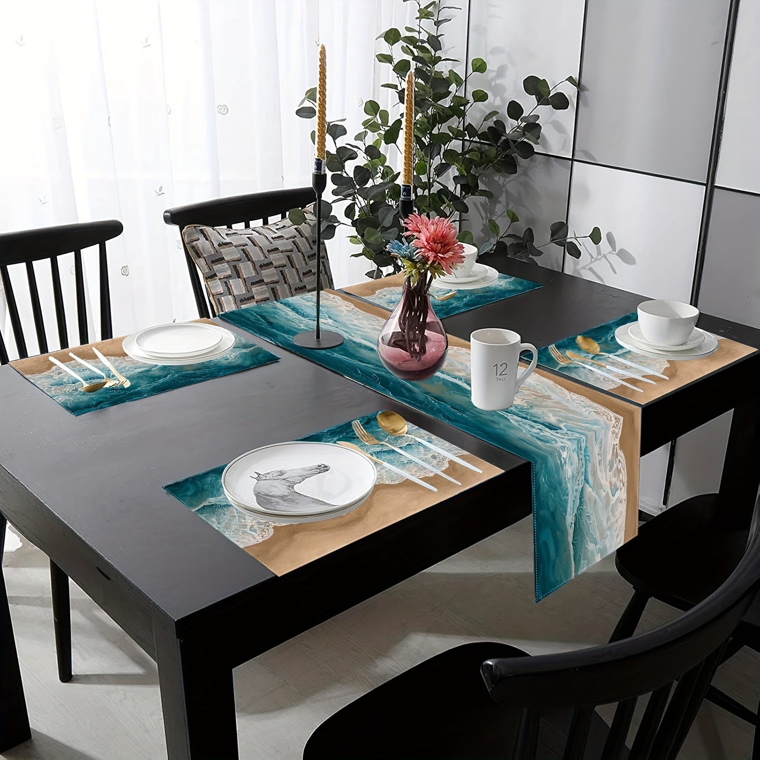 Enhance your dining space with this 7-piece ocean wave table set, featuring 6 placemats (12x18") and 1 coordinating table runner (13x72"). The vibrant blue wave design adds a fresh, coastal touch to your kitchen or dining room, perfect for family meals, gatherings, or special occasions.
