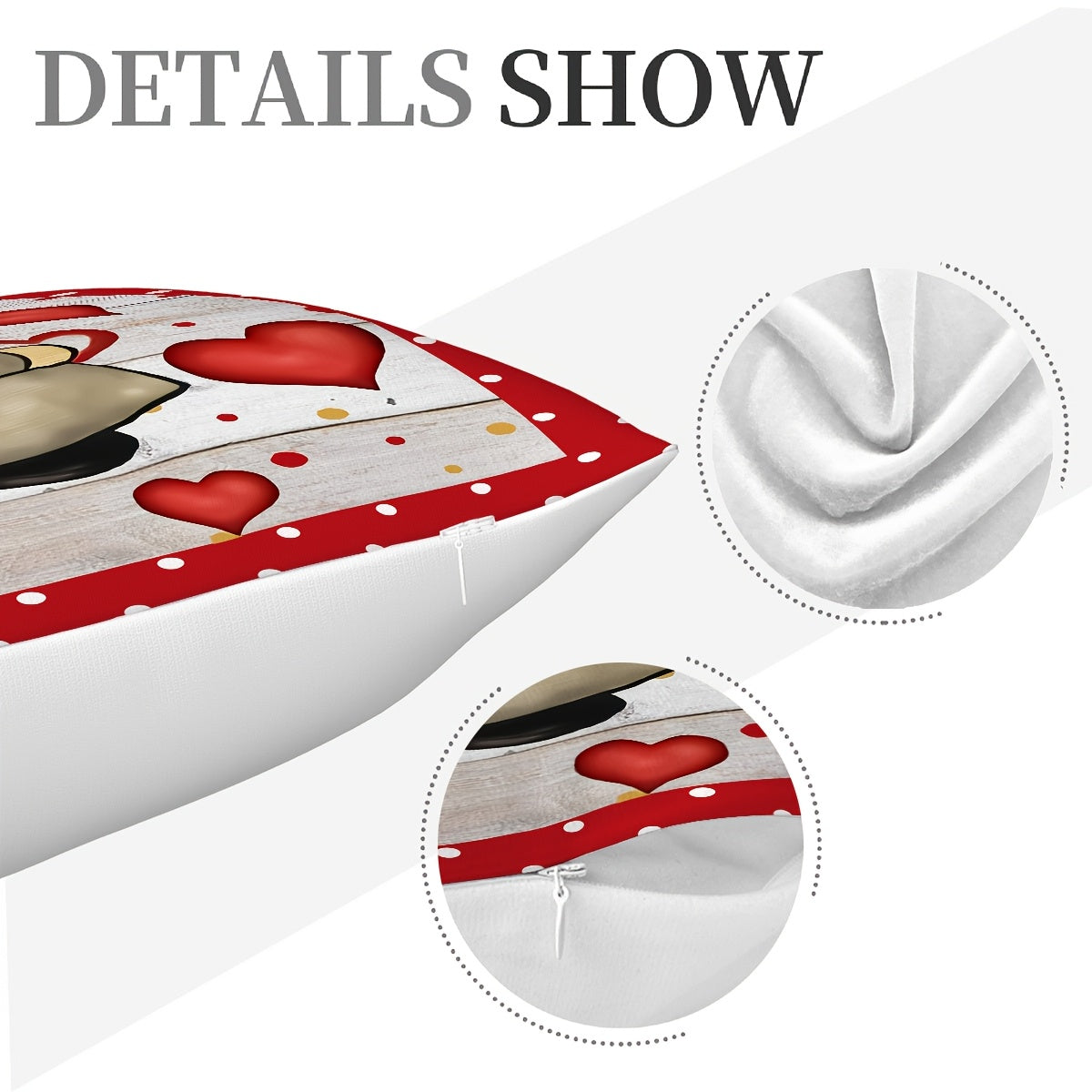 This Valentine-themed pillow cover features an illustrated gnome couple forming a heart with their hats, set against a soft white wood-grain background with scattered red hearts and subtle polka dot accents. The playful yet balanced design brings warmth and personality to sofas, beds, accent chairs, and seasonal displays.
